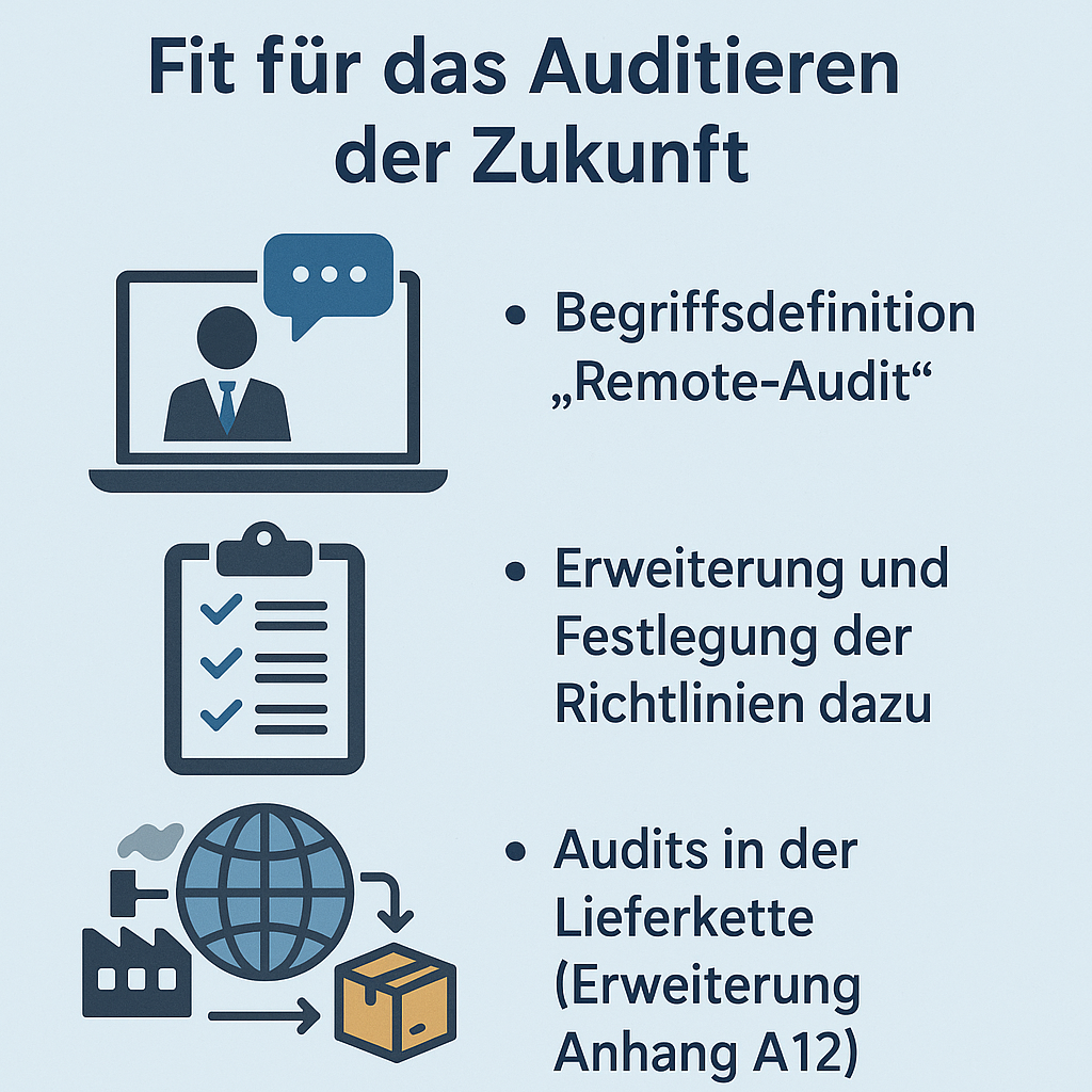 Remote-Audits bekommen einen festen Platz. Der Begriff „Remote-Audit“ wird neu definiert – und es wird klar festgelegt, unter welchen Bedingungen Audits außerhalb physischer Präsenz zulässig sind. Damit wird Remote- oder Hybrid-Auditierung als gleichwertige Methode neben klassischen Vor-Ort-Audits etabliert.