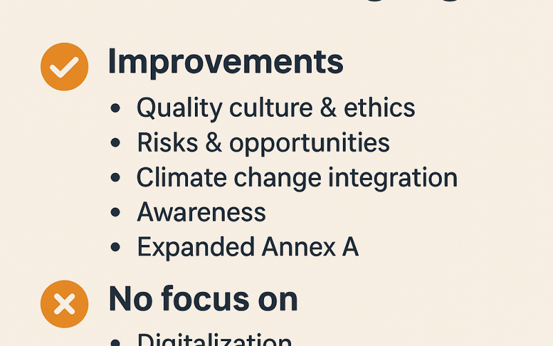 👉 Fazit: Die ISO 9001 bleibt vertraut, wird aber gestärkt – mit Fokus auf Kultur, Ethik und Klarheit.